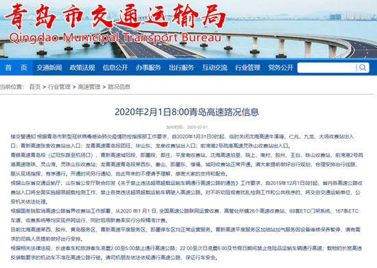 一方面,高速路口都有不同程度封路情况存在,如“根据青岛市新型冠状病毒感染肺炎疫情防控指挥部工作要求,自1月31日0时起,临时关闭青岛市境内十七个高速公路收费站出入口,涉及G15沈海高速牛溪埠收费站、仁兆收费站、G18荣乌高速灰埠收费站、G1813威青高速长直收费站、S19龙青高速马连庄收费站等。”