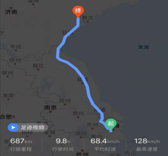 行程路线:笔者老家在山东省胶州市,本次行程从上海市长宁区出发,由天山西路外环路口上高速,途经上海外环高速、沪嘉高速、上海绕城高速、沈海高速(江苏段)、沈海高速(山东段)等,在沈海高速胶州立交收费站下高速。全程687公里,共用时587分钟。