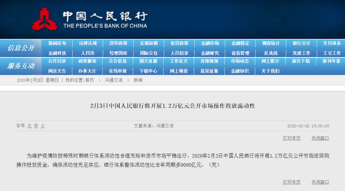 2月2日,央行发布公告称,为维护疫情防控特殊时期银行体系流动性合理充裕和货币市场平稳运行,2月3日将开展1.2万亿元公开市场逆回购操作投放资金,确保流动性充足供应,银行体系整体流动性比去年同期多9000亿元。