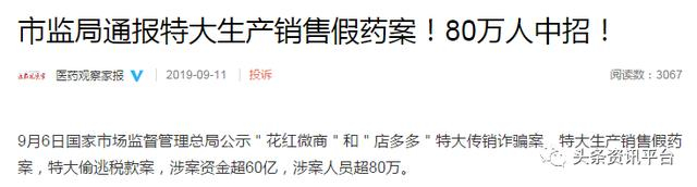 时间来到2019年9月,《医药观察家报》、“医药资讯地方台”、“医药大事记”等多家媒体相继报道了“国家市场监督管理总局公示花红微商和店多多特大传销诈骗案、特大生产销售假药案、特大偷逃税款案,涉案资金超60亿,涉案人员超80万”的消息。(但我们从国家市场监督管理总局官网通过搜索关键词的方式并未搜索到原文,亦没能在网上找到相关页面的截图证实这条消息的真实性)