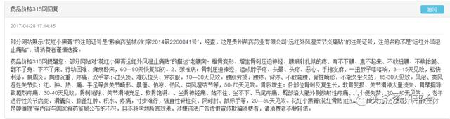 不仅如此,还有一些网站以“远红外风湿止痛贴”(非“远红外风湿关节炎痛帖”)的名义宣传花红小黑膏,对此,“药品价格315网”表示,部分网站对“花红小黑膏远红外风湿止痛贴”的描述“老腰突:椎骨变形、增生骨刺压迫神经、腰眼针扎似的疼、弯不下腰、直不起来、不敢扭腰、不敢抬腿、翻不了身、下不了床、行动困难、瘫痪卧床,60—80天恢复如初……花红小黑膏(花红骨贴)由知名品牌花红药业出品,只有疗效才是硬道理”等内容与国家食药监局公布的不符,且不科学地断言效果,涉嫌违法广告虚假宣传欺骗消费者,请消费者不要轻信。
