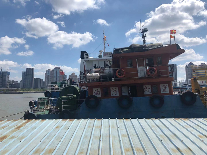 处置油污的小船靠在杨浦轮渡附近。澎湃新闻记者 王昀 图