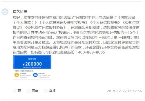 上海造艺在张女士的投诉帖下回应表示,“因为您选择的是分期支付方式,因此您支付评估报告的费用为您向第三方持牌金融机构进行的借款,还请您履行还款义务避免逾期对您造成困扰。”
