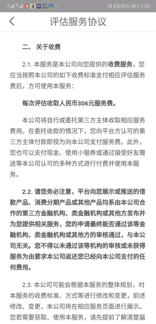 根据《评估服务协议》,上海造艺将根据用户主动提交的信息以及授权采集的信息,委托技术服务合作方进行评估,并提供一份《个人风险等级评估报告》,用于用户自查个人相关资信状况并决定用户是否在平台上继续获取服务。每次评估收取人民币306元服务费。《评估服务协议》还强调,请您特别注意,您的付费及服务选择并不代表本公司对服务结果即您是否能最终获得借款或其他服务提供任何保证或承诺。