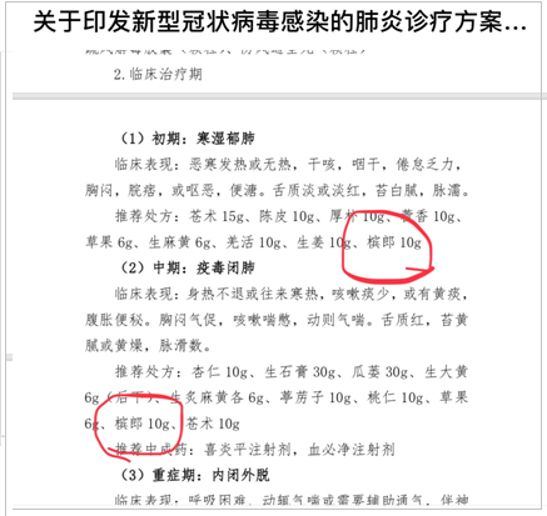 消息本身没有问题,《方案》的中医治疗部分,临床治疗期的初期和中期,的确将“槟郎”作为推荐处方成分。