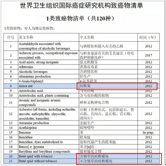 早在2003年,世界卫生组织就把槟榔列入一级致癌物清单。2017年,世卫组织国际癌症研究机构公布120种1类致癌物清单,与槟榔相关的致癌物,占据其中3种。