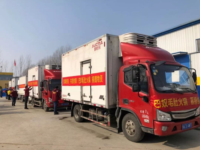 巴奴兵分三路,派出三辆配送车,分别奔赴四个捐助点。