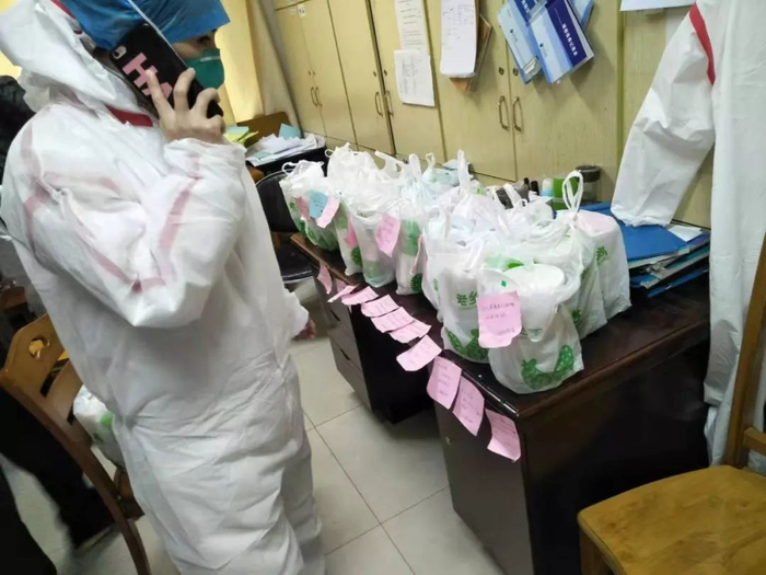 一周前开始,当地的一家快餐店每天给值班的二十余个工作人员送免费午饭,一荤一素两个菜,外加一碗汤。每份饭的包装袋上都贴着一张便签,是店主誊抄的网友祝福:“一切都会好起来的。”“请保护好自己。辛苦了。”“你们守护患者,我们守护你,别忘了还有人等你回家吃饭,请平安归来。”收到餐的第一天,同组一位护士当场就哭了。