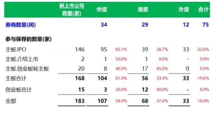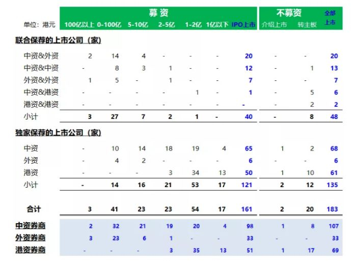 除了纯经营买卖赚佣的证券商以外,截至2019年12月31日,香港持有保荐人牌照的券商共124家,按照参与保荐项目的数量来看,中资券商最多,2019年共75家券商以上市保荐人、或联合保荐人的身份参与了香港183家(包括:IPO上市161家,介绍上市2家,创业板转主板20家)新上市公司的保荐工作,共募资3128.87亿港元。