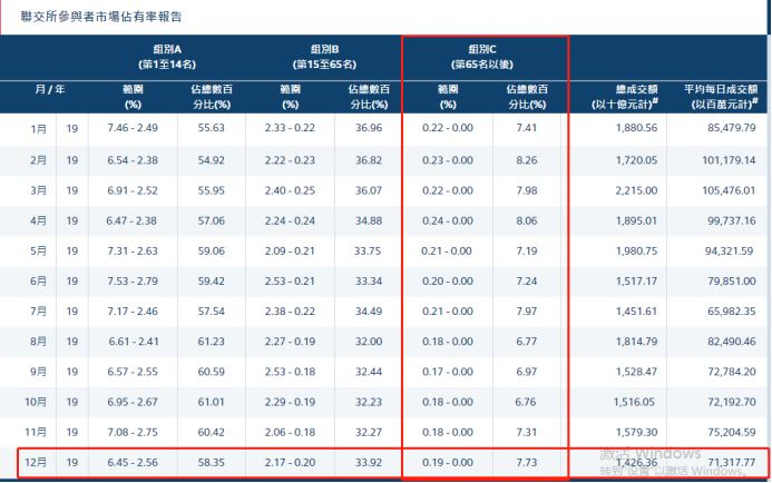 据港交所的统计,2019年12月,份属C组的小型证券行总成交额仅1.43万亿港元。颜招骏表示,保守假设每家券商的佣金率是0.25%(当然现在有的券商是免佣或低至0.0675%),即大约平均每家C组券商证券交易佣金收入只有46.6万港元。