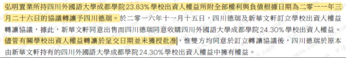 至此,公司对成都学院的权益占比达到100%。为啥呢?撇开新华文轩,早在2011年,弘明置业已经把所持成都学院23.83%的股权通过协议转让给了四川德瑞。弘明置业和四川德瑞同样是受VIE架构控制的经营实体。