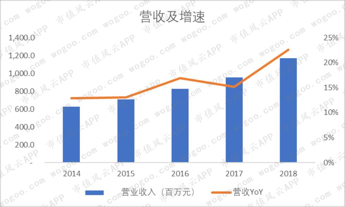 对应公司的营收从2014年6.3亿元增至2018年的11.7亿元,CAGR为17%。