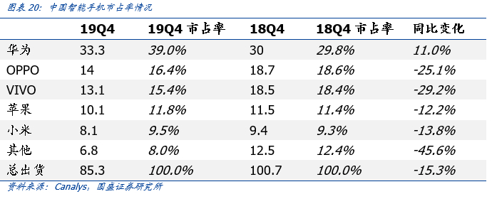 根据IDC的最新报告统计,2019年第四季度全球智能手机出货量为3.688亿部,同比下滑1.1%。从2019年全年来看,三星、华为、苹果、小米、OPPO出货量排名前五位,出货量分别为2.96亿部、2.41亿部、1.91亿部、1.26亿部、1.14亿部。同比分别增长1.2%/16.8%/-8.5%/5.5%/0.9%。目前全球智能手机处于存量市场,随着19年后半年5G商用开启,智能手机有望迎来新增长。