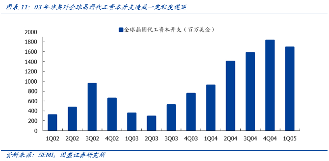 我们同样对03年“非典”前后全球晶圆代工厂资本开支进行回顾,由于03年一季度起的疫情爆发,全球晶圆代工资本开支出现两个季度的锐减,台积电和中芯国际扩产计划放缓(其中台积电松江8寸厂建设延迟),但在疫情缓和后资本开支迅速开始逐渐攀升。