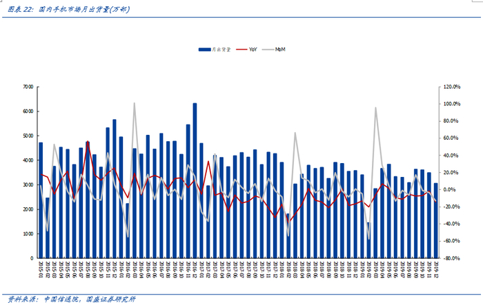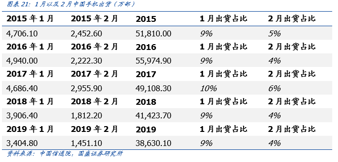 根据中国信通院发布的报告显示,19年12月国内智能手机出货量为3,044.40万部,同比下滑14.7%。我们选取了近五年每年1月以及2月中国国内的手机出货量作为样本,通过对比发现,每年1月的出货量基本占到全年出货占比的9%~10%,每年2月的出货量基本占到全年出货占比的4%~5%,受到疫情的影响2月份的手机出货量或会受到一定的冲击,但是由于2月本身作为全年销售的淡季时期,对全年的出货影响甚微,并且随着疫情得到控制我们认为3月份的终端需求有望企稳。