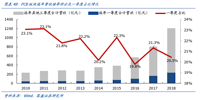 提取过往数年数据,从PCB板块合计营收以及逐年Q1的营收占比情况来看,历年PCB企业的Q1占全年营收之比均在20%左右,为淡季。其原因主要是因为PCB板块做为资产密集的生产制造板块,春节假期影响对于开工率/稼动率仍有一定的影响。