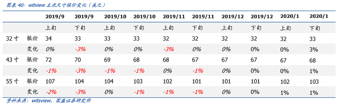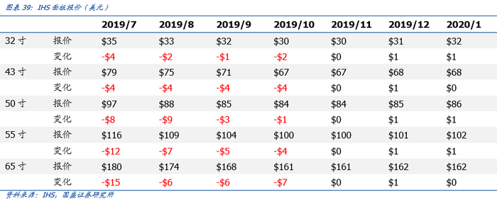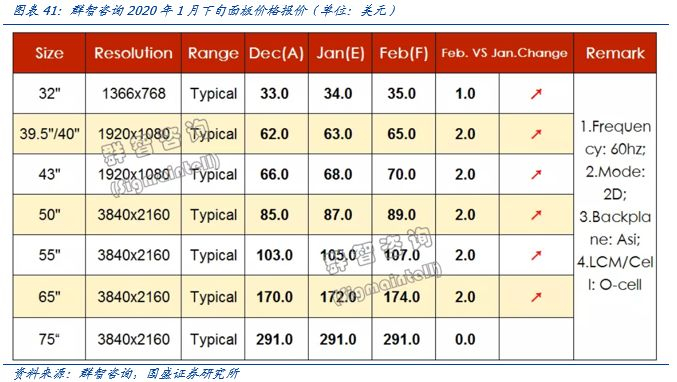 39.5~43寸:供给端增长较少,面板供需偏紧。2月份预计继续上涨2美元。
