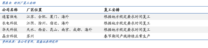 复工有序推进,行业景气度较高。根据我们统计的信息,长电科技、华天科技、通富微电等封测厂根据当地政府规定主要在2.10正式复工,由于行业景气度较高,各工厂均有部分在岗员工持续加班。晶方科技由于产线没有放假,没有复工问题,假期期间公司按规定加强了对厂区和员工管理,确保安全生产。