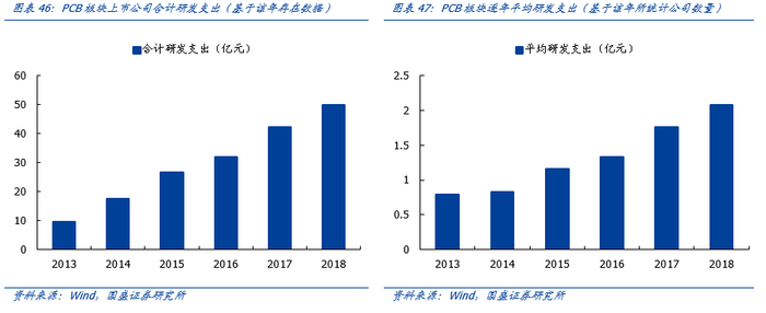 另一方面来看,PCB板块在历年逐步经历的是向高端转移,逐步淘汰低端产能,向龙头聚拢的趋势。我们可以看到从2013年其无论是合计研发支出也好,各家PCB个股的平均研发支出也罢,增速都较大。在研发支出的背后我们认为从表象来看是提高了公司的产品单价、盈利能力,但是再更深处是提高了各个公司在全球这个大市场的竞争能力,从而真正的将国内原先的低端定位的PCB行业形象向高端发展。
