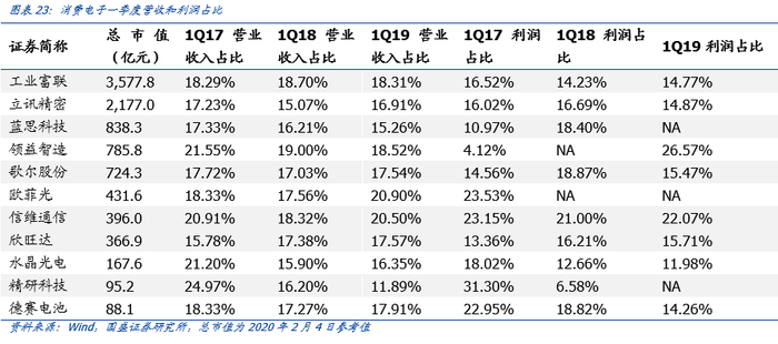 我们选取了消费电子12家公司作为样本,通过比较发现通常一季度的营业收入占全年营业收入占比的15%~18%,一季度的利润占比一般为全年归母净利润的12%~15%,上半年通常为消费电子公司的传统淡季,因此短期的需求变化对消费电子公司的影响有限。