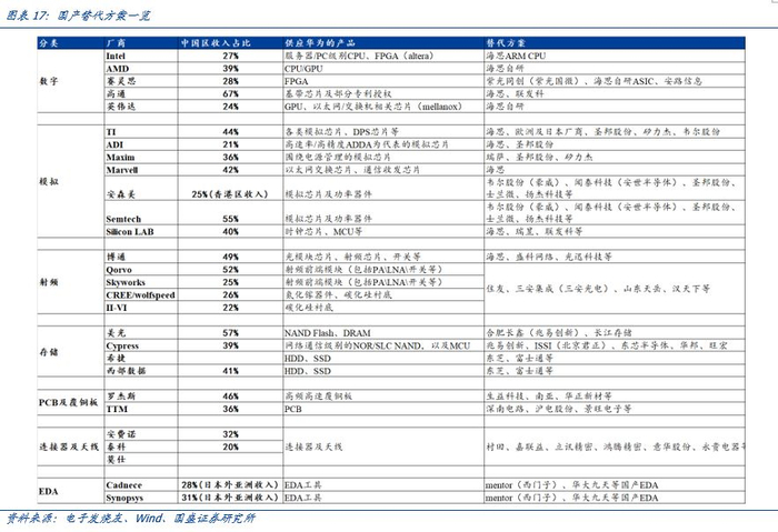 从国产替代的进度来看,华为非A比例稳步提升。数字领域依靠海思自身的能力就非常强,自研强度上来之后替代速度会更快,模拟领域国内有一批不错的优质公司也能够贡献一份力量,射频、存储环节的国产份额也开始逐步提升;
