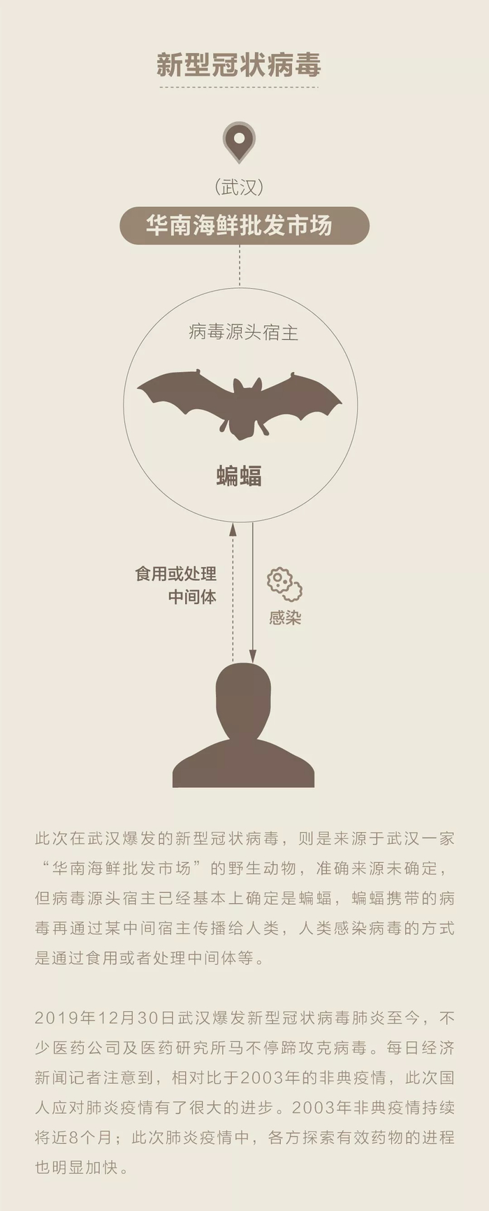 但对于新型冠状病毒,目前也不能排除捕捉宰杀蝙蝠时直接传染的可能性,即新型冠状病毒也可能不经过中间宿主直接感染人类。