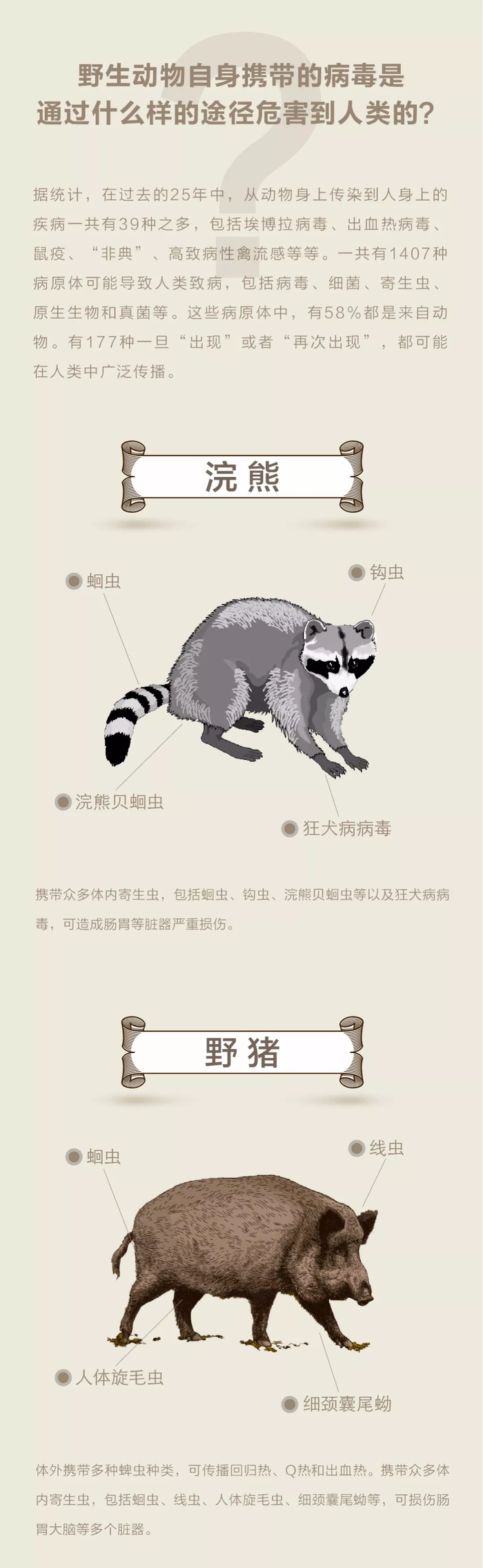 历史上,人类社会多次因野生动物携带的病毒受到广泛影响。《科学公共图书馆•被忽视的热带疾病》杂志发表的一项研究显示,新出现的人类传染病中,有60%以上源自动物,这些人畜共患病的动物源性疾病中又有70%以上来自野生动物。