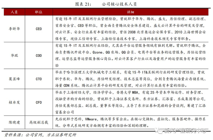 公司创始团队在云计算相关领域的深厚积累以及持续扩张的研发团队奠定了公司在国内云计算领域持续领先的技术优势。公司创始团队在存储、虚拟化、网络、安全等技术环节积累较深。创始人季昕华曾担任盛大云CEO,参与过盛大云整个搭建过程,又曾经担任过腾讯、盛大等公司安全业务的高管。CTO莫显峰和COO华琨均出自腾讯,分别担任腾讯架构部总监和开放平台部运营服务总监。公司核心团队来自腾讯、阿里、百度、华为、VMware等国内外互联网和IT企业,并大量引进传统金融、医疗、零售、制造业等行业精英人才。截至2018年底公司已经建立了约 543人的研发队伍,有效保障公司在国内云计算行业的技术优势。