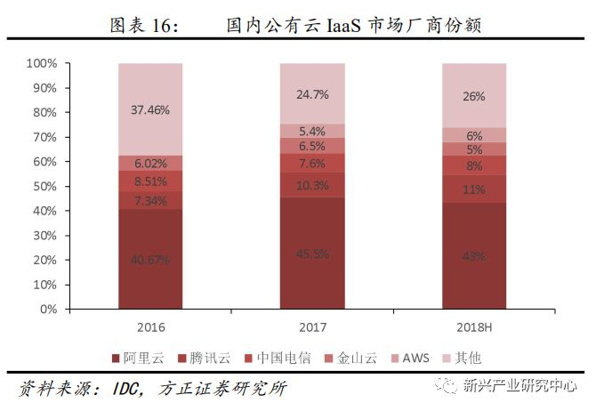 阿里云、腾讯云、中国电信、金山云、UCloud、中国联通、中国移动等云服务商占据了国内大部分IaaS市场份额,并且领先优势还在不断扩大。根据IDC最新统计数据,2018 年上半年国内前五大公有云IaaS服务商阿里云、腾讯云、中国电信、AWS、金山云市场份额合集占比达57%,我国公有云IaaS层的寡头市场格局已经成型,其中UCloud在中国公有云IaaS市场中占比4.8%,排名第六位。