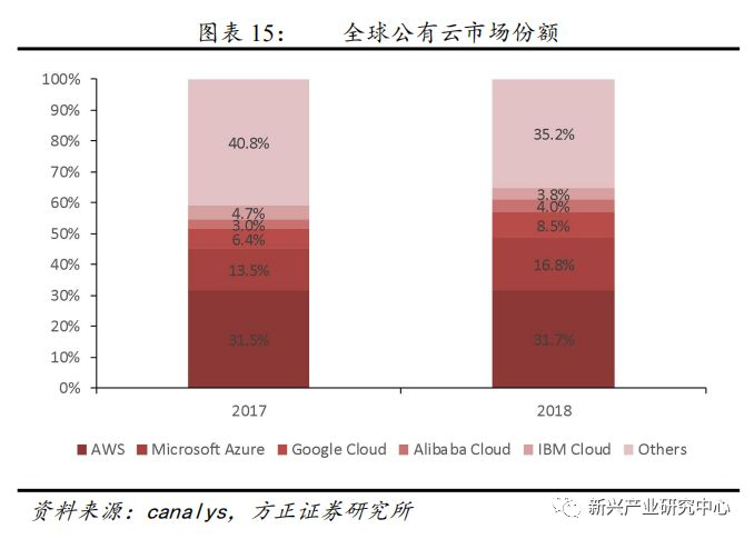 2.2 公有云市场份额正向一线品牌集中在全球云计算领域,近年来亚马逊、微软、谷歌等科技巨头一直保持领先位置,前五大厂商占据65%的市场份额。其中亚马逊领跑全球公有云市场,同时微软云、谷歌云、阿里云也正在迎头追赶,行业整体集中度仍在不断提升。随着云计算市场需求持续增长,行业规模正在不断扩大。公有云壁垒高、技术成熟、客户黏性大、规模效应强的行业特性,决定了寡头格局将长期持续并不断强化。早期布局云计算行业的一些大型企业凭借自身的规模效应使得其业务运营的边际成本明显下降,议价能力显著增强,基于多年的经营,其自身产品线也较为丰富,已共同占据大部分市场份额。从全球范围来看,亚马逊、微软、谷歌等科技巨头虽一直保持寡头竞争格局。