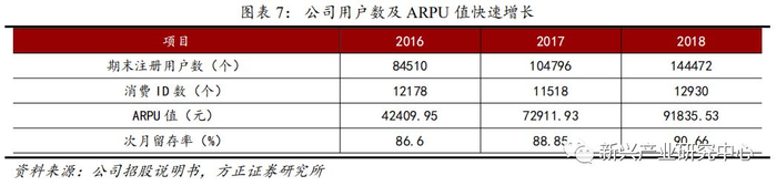 公司在互联网及传统行业拥有丰富的客户资源,与多家客户建立了较为密切的合作伙伴关系。截至 2018 年末,公司公有云平台注册用户数达到 14.45 万名,2016-2018 年公有云平台消费 ID 数分别为 1.22 万个、1.15 万个和 1.29 万个,单个ID的ARPU值分别为 4.24 万元、7.29 万元和 9.18 万元,呈快速增长趋势,用户平均次月留存率分别为 86.60%、88.85%和 90.66%,客户留存率不断提升。