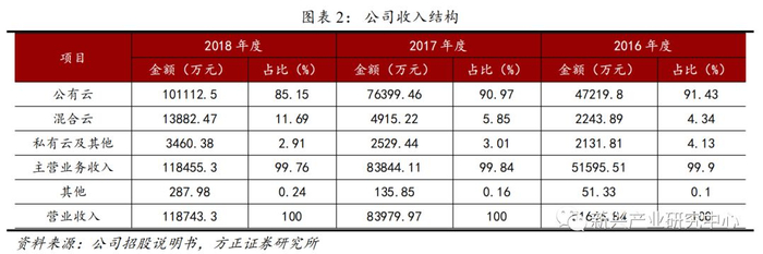 公司成立之初主要专注于公有云IaaS服务领域,此后公司逐步由公有云向私有云、混合云拓展,由IaaS向PaaS不断延伸。公司成立于2012年,当年7月Ucloud云平台开始上线运营,率先切入移动游戏市场。在2016年私有云服务提供商UMCloud(上海优铭云)注册成立,公司出资4013万元控制了UMCloud 80%的股份,宣告正式进军私有云。2017年12月,公司对UMCloud另外20%的股份进行了全资收购。2018年4月,子公司UMCloud合并PaaS容器云厂商“数人云”。公司经营业绩近年实现迅速增长,2018年实现营收11.9亿元,同比增长41.3%,净利润7715万元,同比30.1%。