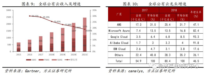 2.1 国内云计算市场正处于快速成长期全球云计算市场正处于快速成长期。根据Gartner的统计数据,2017年以IaaS、PaaS 和 SaaS为代表的全球公有云市场规模达到 1110亿美元,平均增速为29.22%,预计未来几年全球公有云市场仍将保持20%以上的高速增长。其中,IaaS是增速最快的细分领域,2017 年全球IaaS市场规模达326亿美元,增速达35.27%,其中,计算类服务占据了92%的市场份额,预计到2021年市场份额将扩大到 95%左右。同时,亚马逊AWS、微软Azure、谷歌云等平台增速远超市场平均增速,行业集中度正在逐步提升。