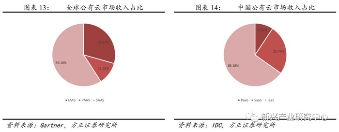 不同于全球公有云市场,IaaS在中国公有云市场中占据主导地位。2018年中国IaaS市场规模为46.83亿美元,在中国公有云市场中占比高达65 %,主要原因为我国云计算市场发展仍处于对计算、存储等传统IT基础资源的替代过程中,云服务商主要致力于通过 IaaS等云服务形式向企业提供IT基础资源。同时我国SaaS、PaaS业态发展仍不成熟,市场规模相对较小。
