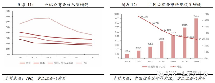 中国是全球公有云增速最快的市场。根据IDC统计数据,2018年中国公有云市场规模同比2017年增长66.82%,增速领跑全球。未来几年随着中国公有云市场规模基数的不断扩大,增速有所放缓,IDC 预计,到2021年中国公有云市场仍将保持33.64%的高增速,美国、欧洲等地区的增速则保持在20%上下。