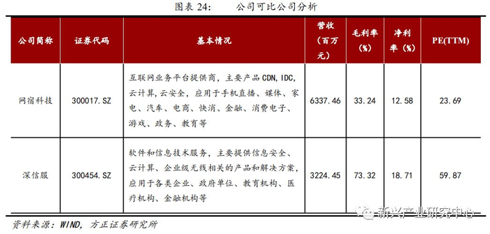 公司主要从事国内公有云Iaas服务,从业务属性来看,A股市场中暂无与公司同一层面的直接可比公司。我们选取了网宿科技、深信服来进行比较。
