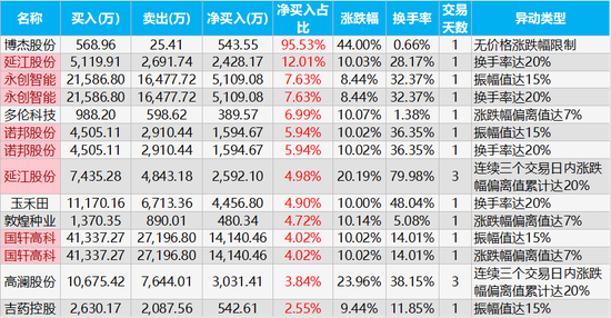 龙虎榜净买入占比最高的三只股票是博杰股份、延江股份、永创智能,净买入金额为543.55万元、2428.17万元、5109.08万元,净买入占比分别为95.53%、12.01%、7.63%。
