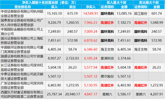 龙虎榜净买入金额前三的营业部是中信证券杭州延安路证券营业部、国泰君安广州人民中路证券营业部、中金公司上海分公司,净买入金额分别为1.45亿元、7966.23万元、7009.24万元,买入金额最大的个股分别为国轩高科、高德红外、国轩高科,所对应的买入金额分别为1.31亿元、7182.73万元、7249.81万元。