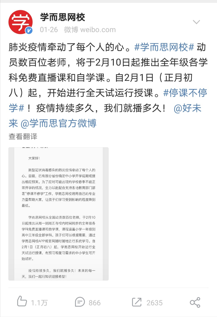 其次,疫情不散,直播不停。各校公布了免费直播课的开课时间,但尚无具体停课时间,原则上都是一直持续播到疫情结束,学生正常返校上课。