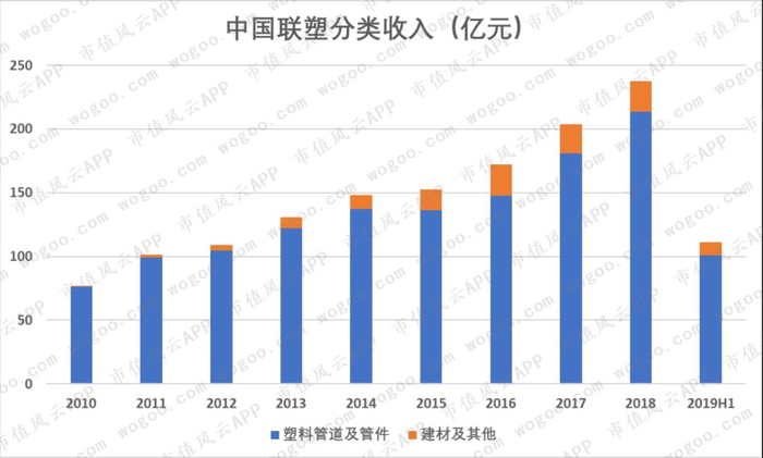 公司的塑料管材管件收入从2010年的76.12亿元上涨至2018年的213.43亿元,复合增速为15.87%,并且占总营收的比例始终在85%以上。