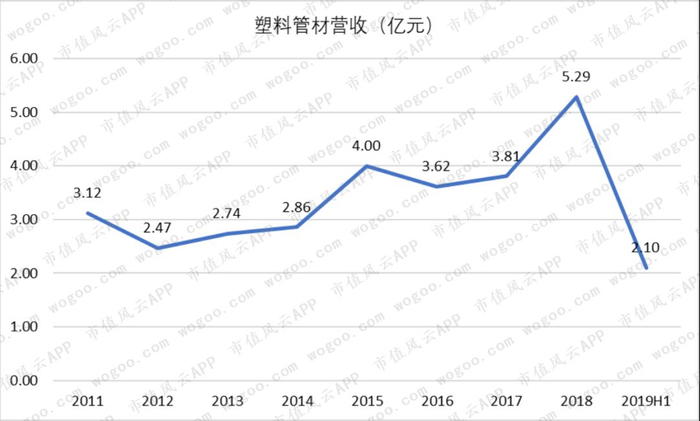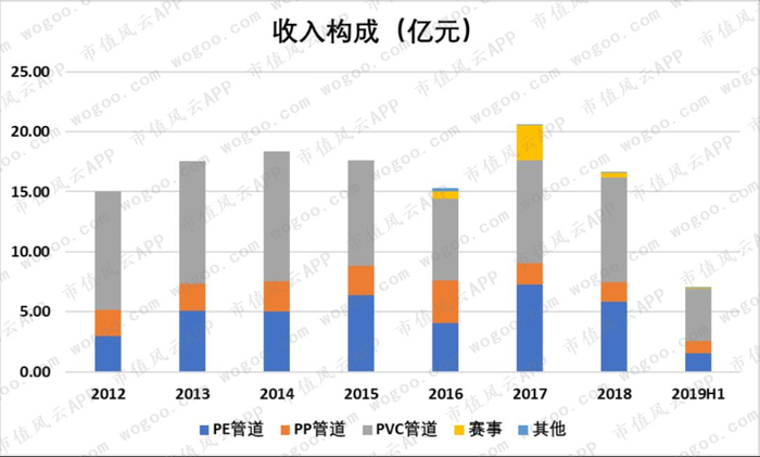 但该收入只是昙花一现,2018年就收窄至0.41亿元,占当期收入近2.48%,表明进军赛事领域受挫,主要收入来源始终是塑料管材。