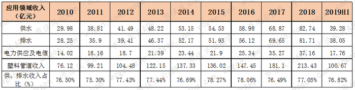 而从应用领域看,供水和排水是塑料管材管件的主要应用领域,两者占总收入的比例超7成,2018年为77.05%。