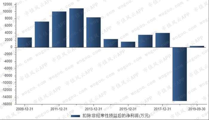 而扣非净利润表现更惨不忍睹,2013年已现颓势,2015年跌至1590.19万,2018年因计提大额资产准备亏损1.5亿,上市至今仅盈利1.6亿元。