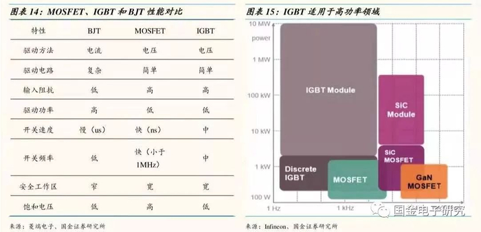 ◾ IGBT适用于高压领域:IGBT 是由 BJT 和 MOSFET 组成的复合功率半导体器件,既有 MOSFET 的开关速度 高、输入阻抗高、控制功率小、驱动电路简单、开关损耗小的优点,又有 BJT 导通电压低、通态电流大、损耗小的优点,在高压、大电流、高速等方面是其他功率器件不能比拟的,因而是电力电子领域较为理想的开关器件,是未来应用发展 的主要方向。IGBT稳定性比MOSFET稍差,强于BJT,但IGBT耐压比MOSFET容易做高,不易被二次击穿而失效,易于高压应用领域。