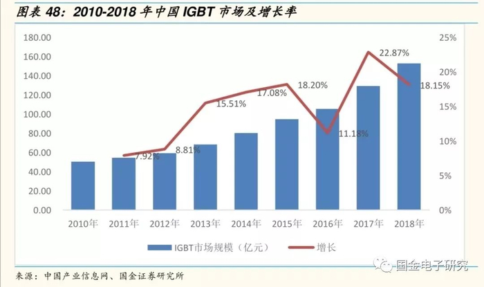 ◾ “十三五“期间,国内IGBT国产化加速,IGBT需求迅猛发展,到2018年,国内IGBT市场规模达161.9亿元。
