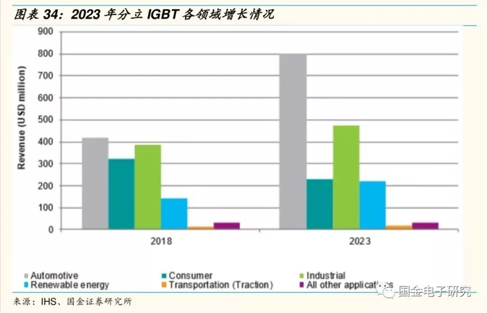 2.4.1 分立IGBT各领域增长:汽车市场2023年将占分立IGBT的45.1%。
