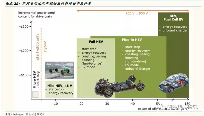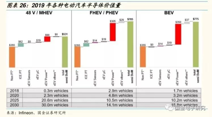 ◾ 根据Infineon数据,2019年,4V轻混汽车需要增加90美元功率半导体,插电或者油电混动需要增加305美元功率半导体,纯电动需要增加350美元功率半导体。