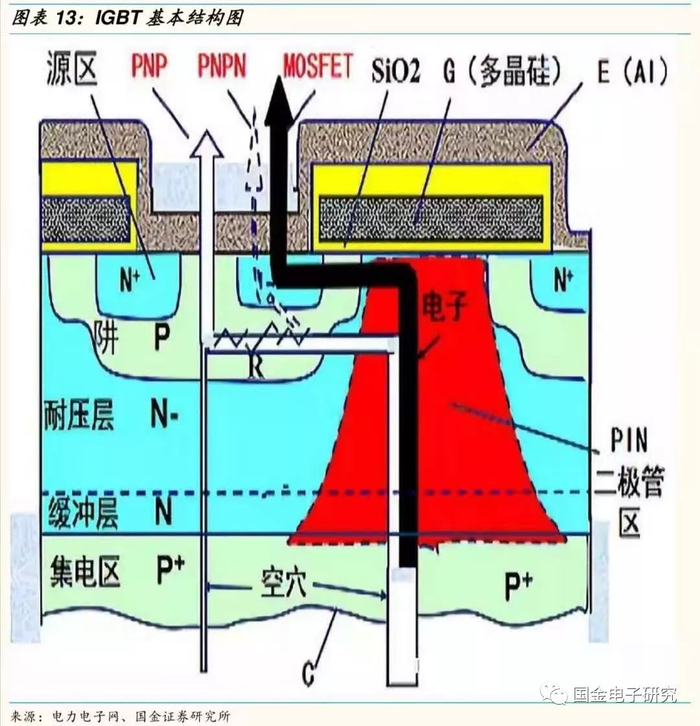 ◾ IGBT是一个工作原理复杂的集成功率半导体器件。结构上, IGBT几乎集成了半导体器件的所有基本结构,如二极管、BJT、结型场效应晶体管JFET,MOSFET, SCR。IGBT的结构参数发生变化,将引起其性能发生相应的变化。工艺技术上,IGBT利用MOS集成电路工艺进行大面积的功率集成,设计上表现为单元胞尺寸的缩小,并联集成的元胞数量越多,通态压降 (导通损耗) 逐渐减小。