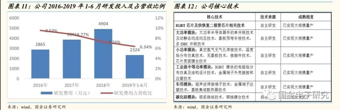 ◾ 公司具有较强的芯片研发能力,已研发出600V、1200V、1700V芯片,并大量配套使用,2016 年、2017 年、2018 年和 2019 年 1-6 月,公司自主研发的 IGBT 及快恢复二极管芯片采购数量占当期 IGBT 及快恢复二极管芯片采购总量比例分别为31.04%、35.6%、49.0%和 54.1%。