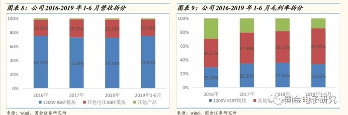 ◾ 1200V IGBT模块占比超过70%:1200V IGBT模块是公司的主要产品,近几年一直保持70%以上的占比,2019年1-6月营收占比为74.82%,毛利率相对稳定,2016年-2019年1-6月,毛利率分别为 25.38%、28.24%、27.32%和 26.83%。
